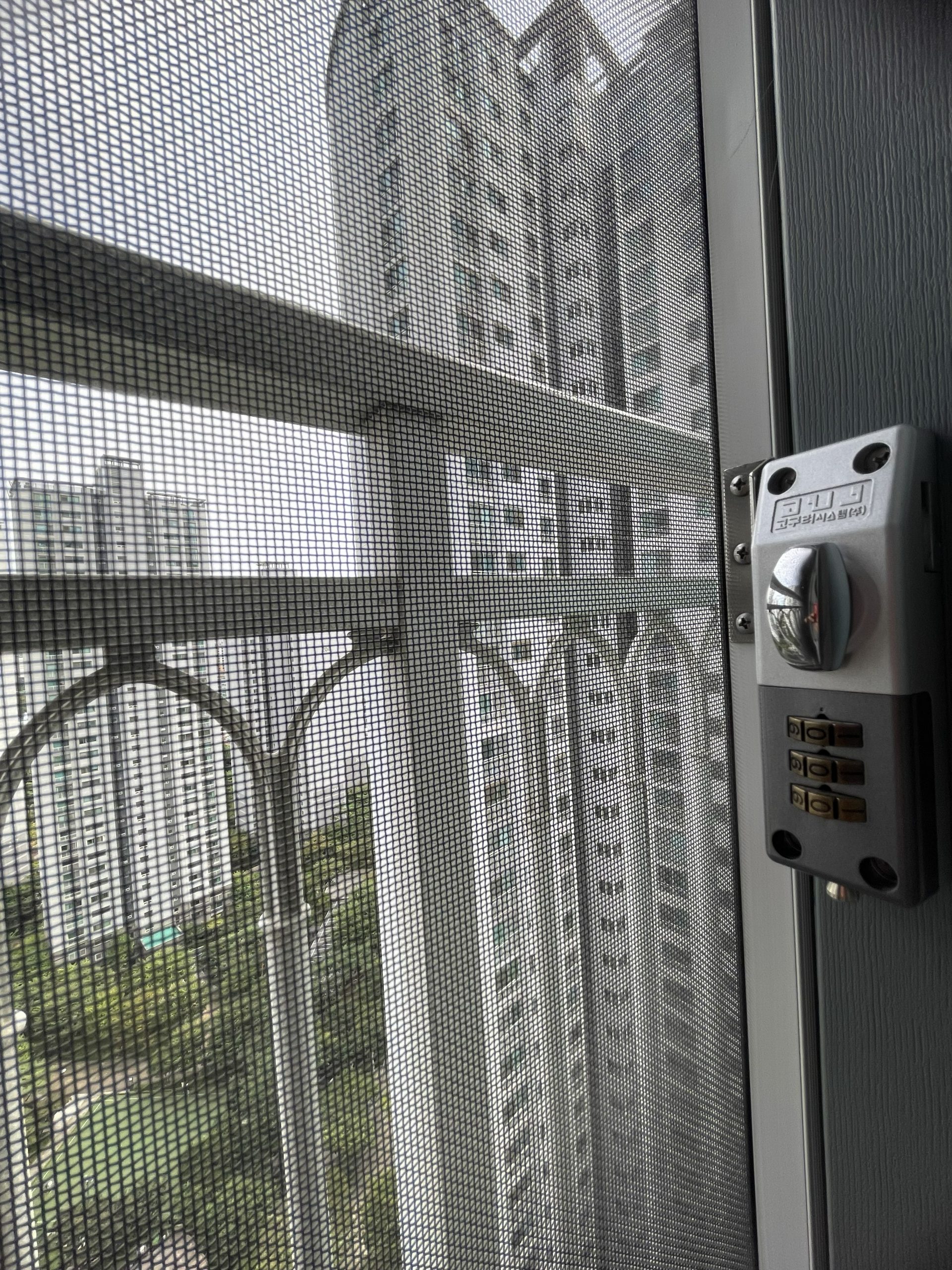 근접하여 망 자체에 초점을 두고 촬영하였습니다. 일반 방충망에 비해 약간 두꺼워 보이지만 외부를 보거나 할 때에 가시성에 큰 차이는 없어 보입니다.